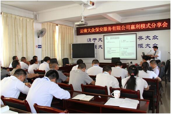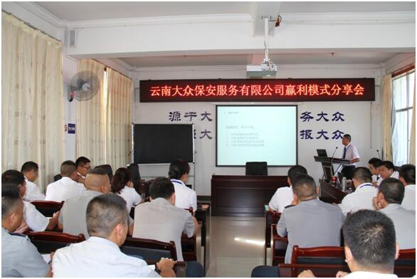 2015年7月4日上午9:00時,大眾保安公司在公司四樓會議室開展了“贏利模式”培訓分享會,會議由公司本部、安防分公司全體行政管理員工和思茅區保安服務中心大隊長共66人參加。
