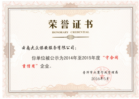 2016年7月,云南大眾保安服務(wù)有限公司被普洱市工商行政管理局授予2014年至2015年度“守合同重信用”企業(yè)稱號,這是公司自2012年以來4年獲得此殊榮。