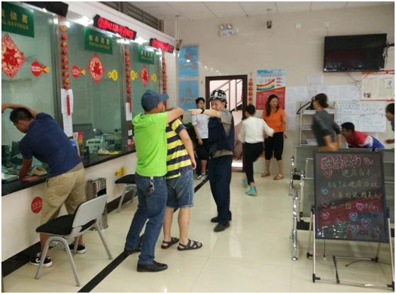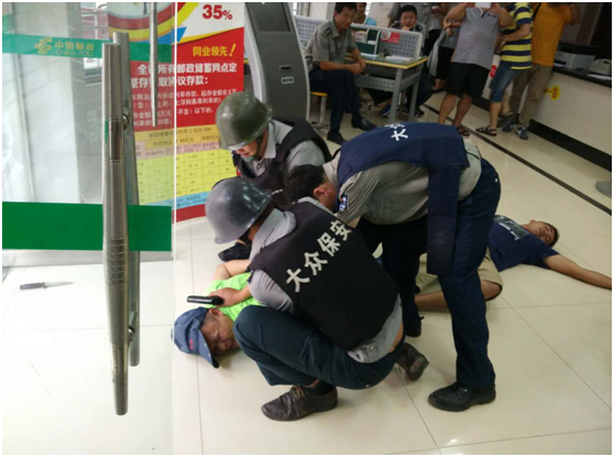 為增強網點保安員和銀行員工安全責任意識,提高網點保安員和銀行員工應對突發事件的能力,2016年8月11日下午18:00時,大眾保安公司寧洱分公司與寧洱縣郵政局在鳳新街營業網點聯合開展防搶、防爆、消防預案演練。
