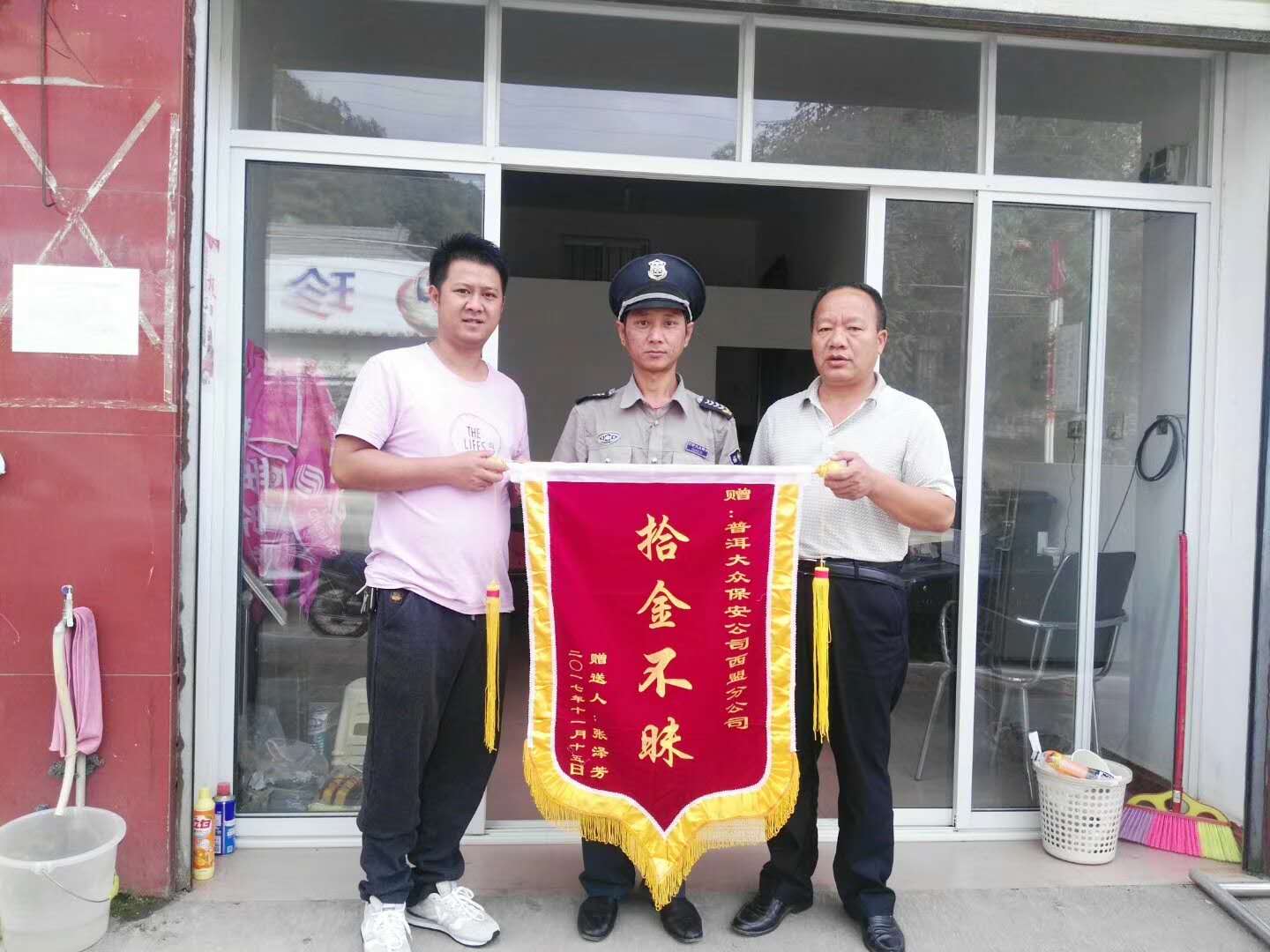 11月15日中午,張女士帶著一面寫有“拾金不昧”的錦旗到云南大眾保安公司西盟分公司辦公室找到了為她找回錢包的歐嫩和巖響兩名保安員,當面授予錦旗并要給兩名保安員獎金以示感謝,保安員歐嫩和巖響接過錦旗的同時謝絕了張女士給的獎金,說到:“每天到醫院就診的人很多,病人或親屬丟了錢包都很著急,能盡快找到失主并將錢包歸還,是我們最開心的事。作為一名保安員,保人民群眾的人身和財產安全是我們的職責。。”